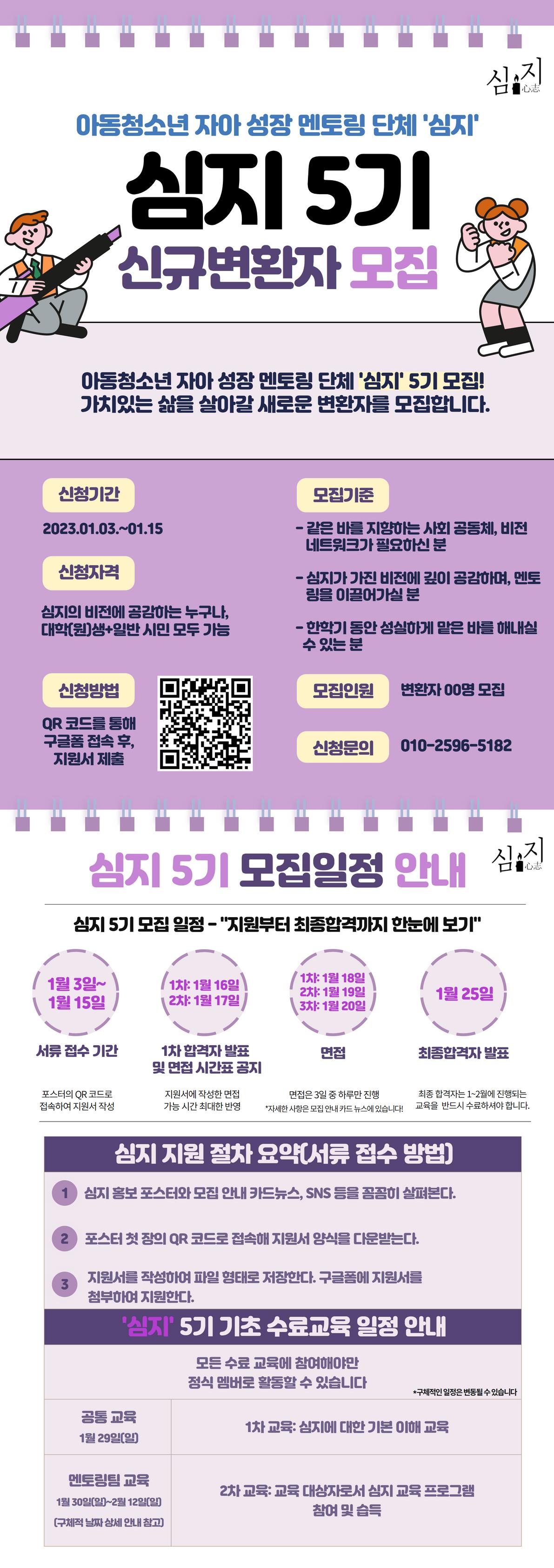 아동청소년 자아 성장 멘토링 단체 "심지"에서 5기 변환자를 모집합니다!