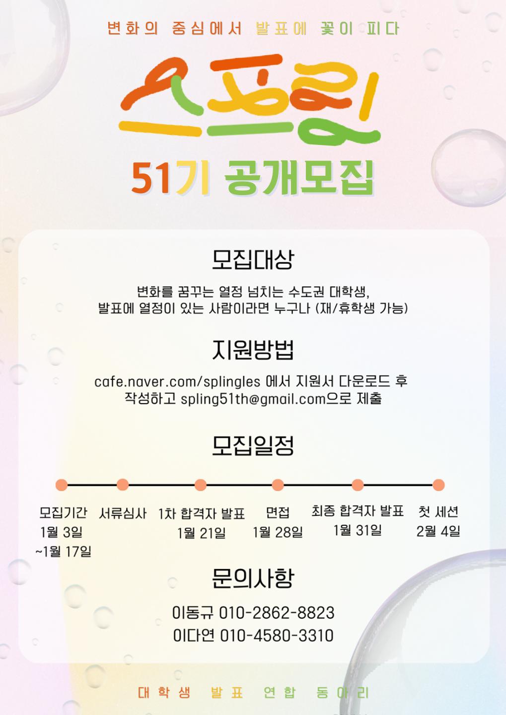 💥[D-4]대학생 연합 발표 동아리 스프링에서 ‘51’기를 모집합니다.